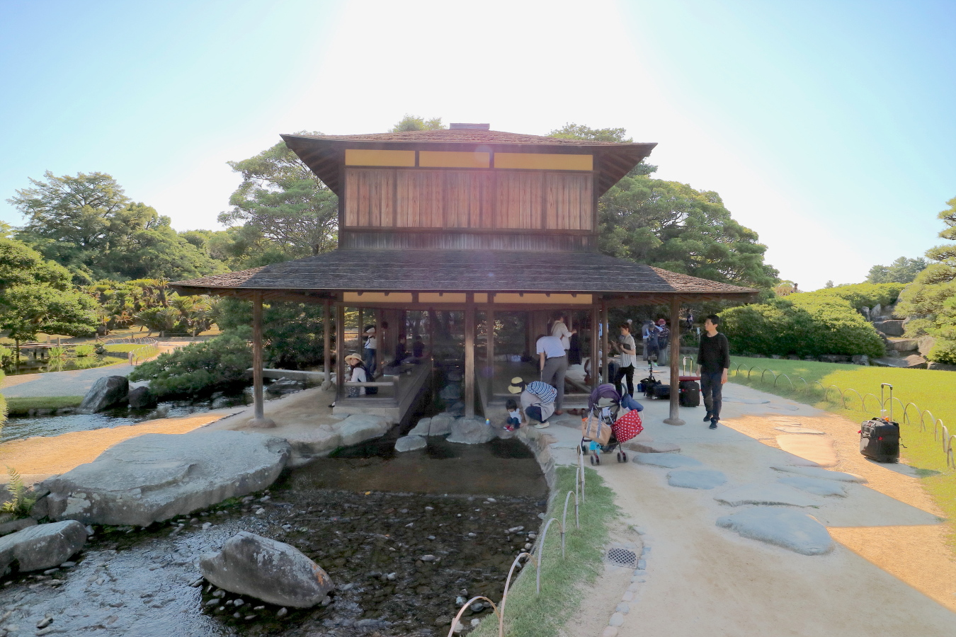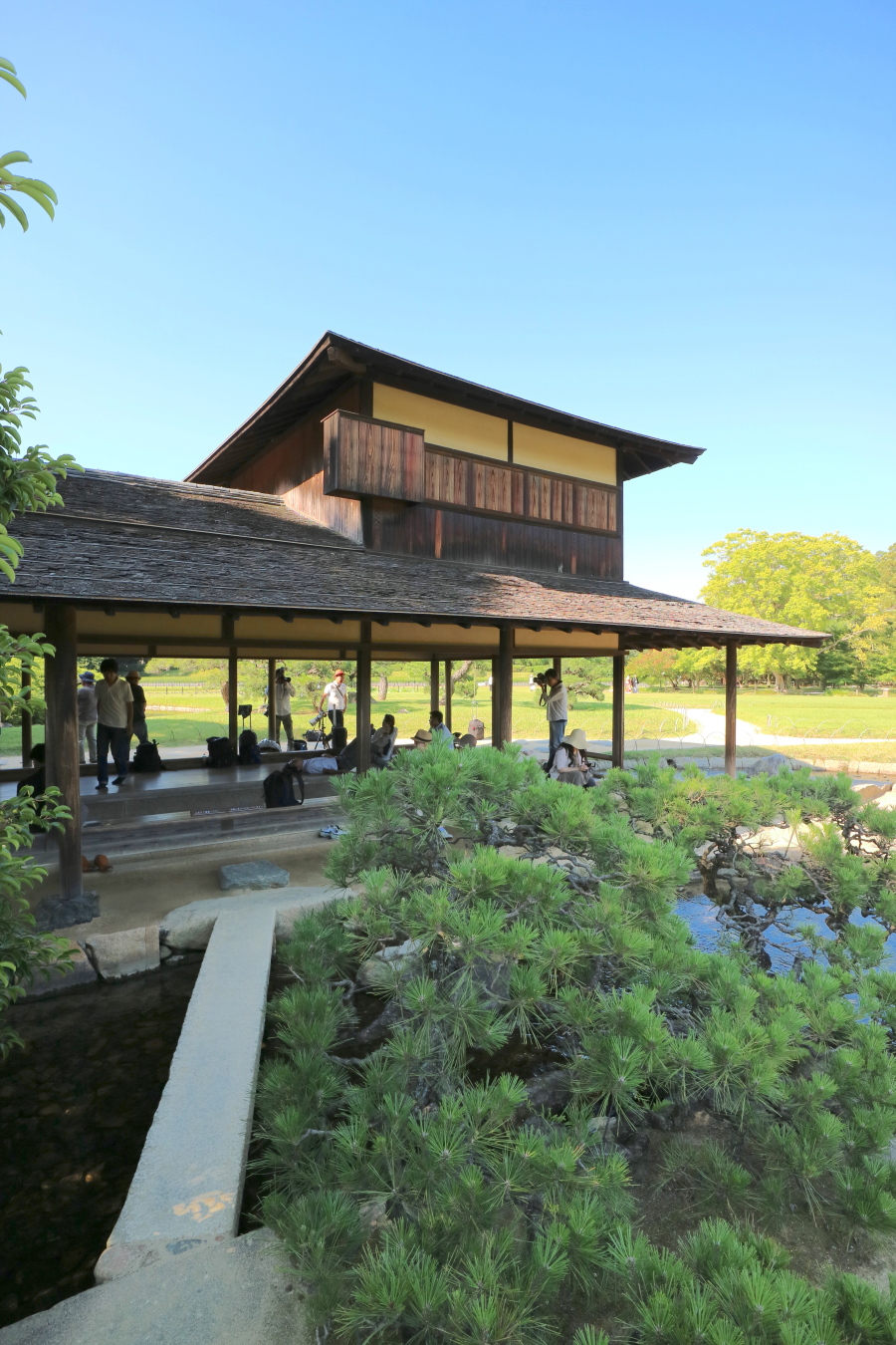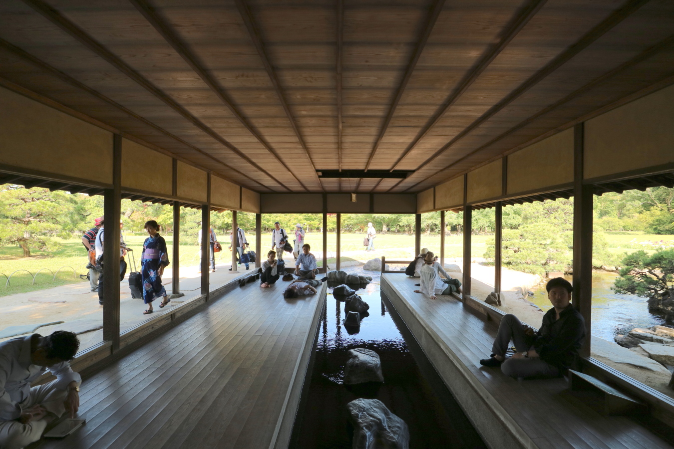 参った日も、来園者が板の間で寝転び休んでいました。きっと江戸時代のお殿様も疲れた足の具足を脱いで水面に浸し、足の疲れが癒えるまで目は周囲の緑の絵画を眺めて疲れを忘れさせられたのかも知れません。